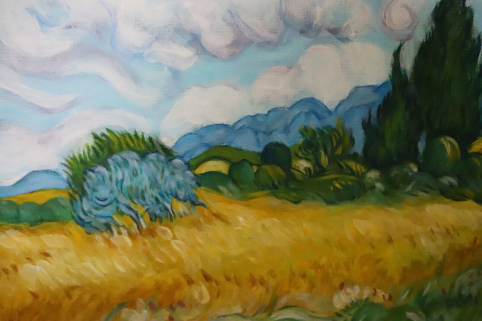 Peint à Saint-Rémy-de-Provence, ce tableau mêle la puissance du vent, les tourbillons du ciel et les tons dorés du blé. Les cyprès sombres dressés comme des flammes traduisent à la fois la vie, l’énergie et la tension intérieure de l’artiste. Un paysage vibrant, presque vivant, où la nature devient émotion.