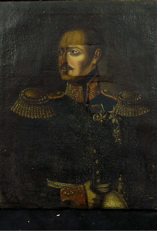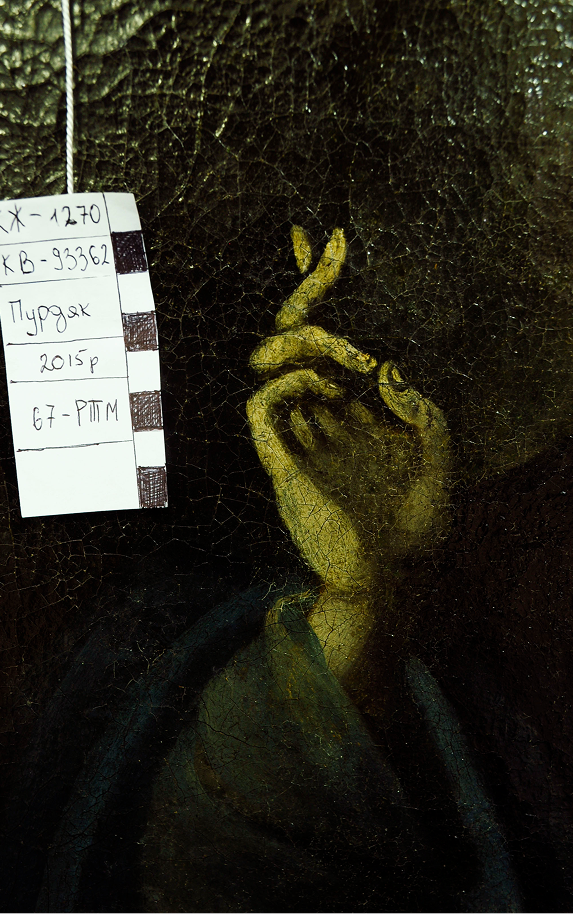 Le portrait présentait les dommages suivants : une déchirure de la toile sur le côté droit du tableau (en arrière-plan), un vernis noirci, des craquelures fines ainsi que de légères pertes de la couche picturale.